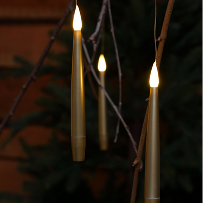 An awe of mystery is created wherever you choose to hang these magical gold floating candles by Noma. Complete with a push button magic wand to activate the warm white LED's. Each candle can be hung from the clear wire string included.
